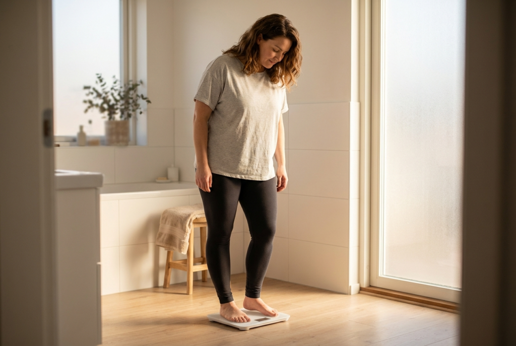 Not forever — just for one or two weeks. Track what you’re actually eating, not what you think you’re eating. As you lose weight, your caloric needs genuinely decrease. The portion that put you in a deficit at 220 lbs may not be enough at 185 lbs. Small adjustments — not dramatic cuts — often restart progress.
